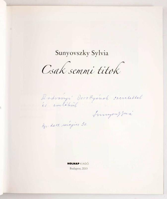 Sunyovszky Sylvia: Csak semmi titok. A szerző, Sunyovszky Szilvia (1948-) Kossuth- és Jászai Mari-díjas színésznő által Radványi Dorottya (1960-) Kazinczy-díjas tévébemondó, műsorvezető részére dedikált példány! Bp., 2013, Holnap. DVD-melléklettel. Kiadói kartonált papírkötés.