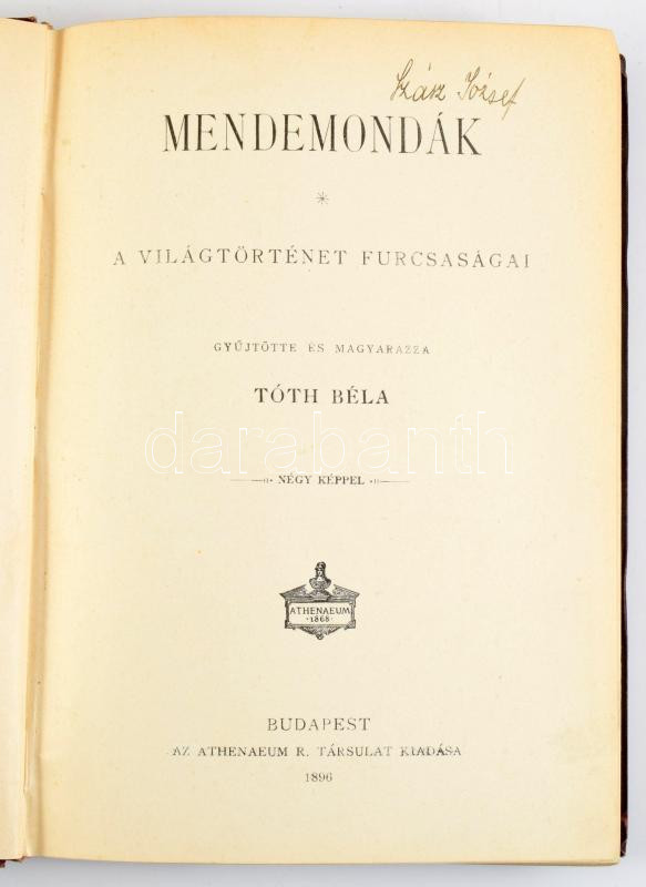 Tóth Béla: Mendemondák. A világtörténet furcsaságai. Gyűjtötte és magyarázza: - - . Bp., 1896, Athenaeum, 354p. Kiadói Gottermayer egészvászon kötésben