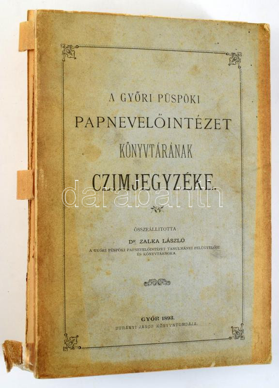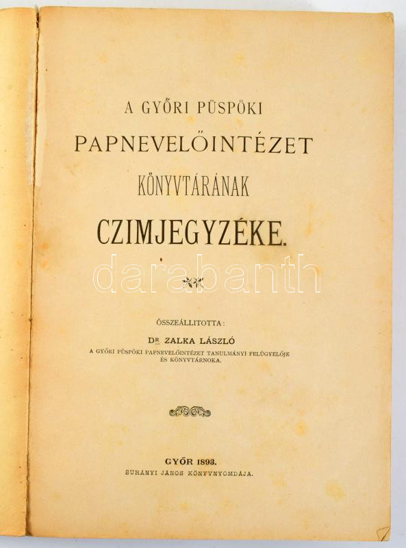 Zalka László: A Győri Püspöki Papnevelőintézet könyvtárának czimjegyzéke. Összeáll.: Dr. - -. Győr, 1893., Burányi János, VIII+2+950 p. Kiadói papírkötés, foltos borítóval, szétvált kötéssel (416-417 között), de ezeket leszámítva jó állapotban. Felvágatlan példány.