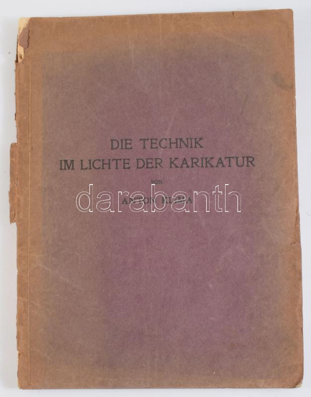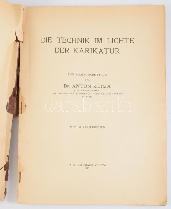 Anton Klima: Die Technik im Lichte der Karikatur. Wien, 1913, Franz Malota, 8+135 p. Német nyelven. Gazdag képanyaggal illusztrált. Kiadói papírkötés, sérült gerinccel és kötéssel, a könyvtest elvált a borítótól.
