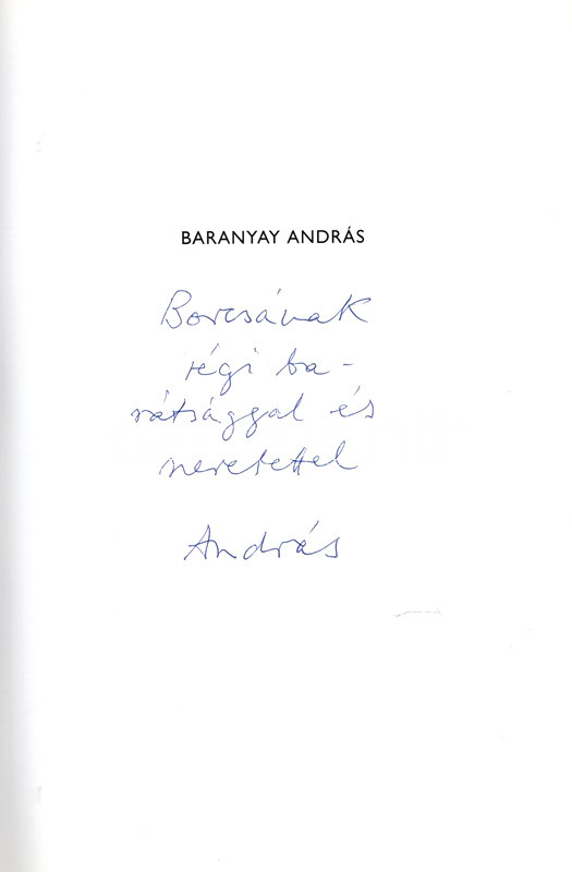 Dedikált: "Borcsának régi barátsággal és szeretettel: András". A kötetben elhelyezett betétlapon a művész újabb autográf üzenete: "Küldi: Baranyai Bandi".