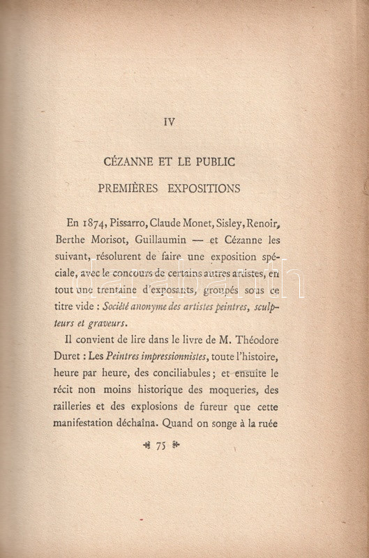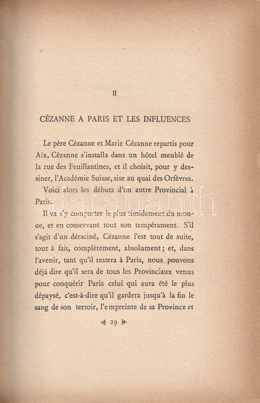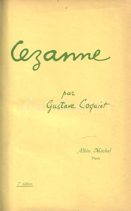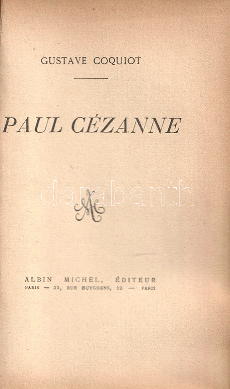 Gustave Coquiot (1865-1926) francia műgyűjtő és művészeti író. Paul Cézanne (1839-1906) festőművészről írt kismonográfiája életrajzi dokumentumok alapján mutatja be a művész pályáját, majd elemzi Cézanne kompozícióit. A kismonográfia először 1919-ben jelent meg, kötetünk a hetedik lenyomatból való.