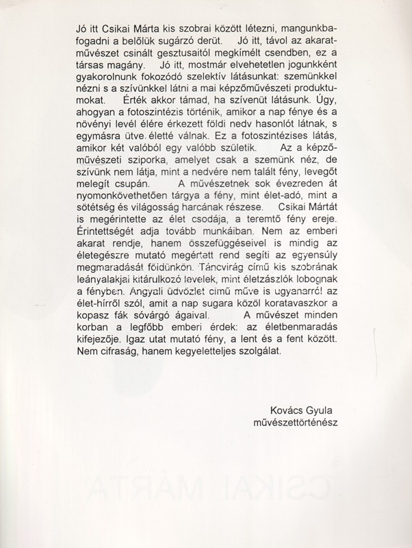 Csikai Márta (sz. 1939) Munkácsy-díjas szobrászművész, a Képzőművészeti Főiskolán Pátzay Pál és Somogyi József tanítványa. Kisplasztikái mellett monumentális szobrászata is számottevő, természeti és szakrális témákban számos köztéri szobra látható. Alkotótevékenysége mellett a Képző- és Iparművészeti Szakközépiskola óraadó tanára. Kötetünkben elhelyezve a szobrászművész kiállítási meghívója (Vigadó Galéria, 1994).