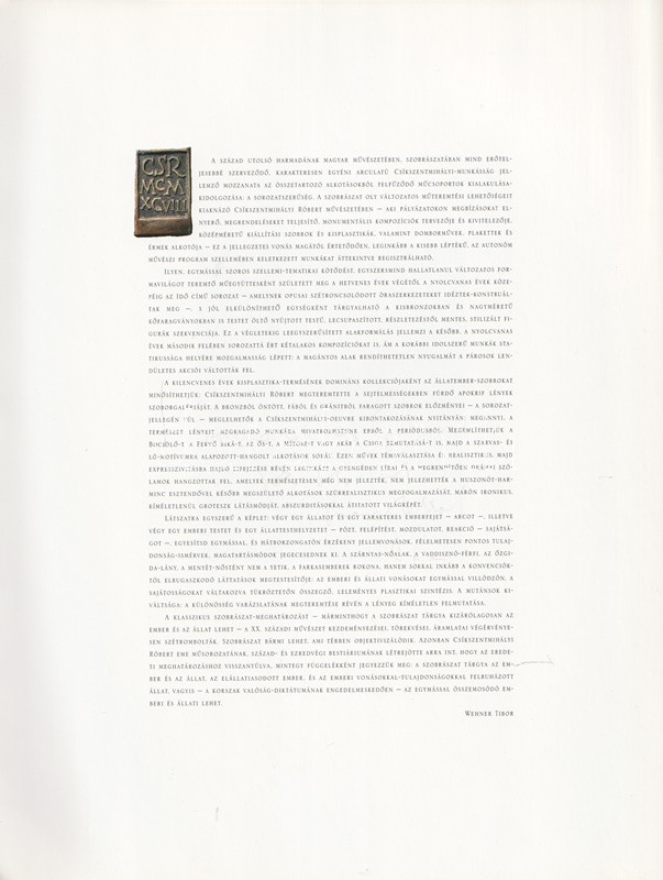 Csíkszentmihályi Róbert (1940-2021) Kossuth-díjas szobrászművész, éremművész, a Nemzet Művésze. A Képzőművészeti Főiskolán Pátzay Pál és Szabó Iván voltak a mesterei, olaszországi és indiai tanulmányútjait követően kiállításokon 1967-től vett részt. Figurális művészete köztéri kompozícióin tanulmányozható. Eleinte fával és mészkővel dolgozott, nemesebb anyagokhoz: bronzhoz, mészkőhöz csak később fért hozzá. Szolnoki kiállításán az utóbbi évek figuratív alkotásainak javát mutatta be. Gazdagon illusztrált, angol-magyar nyelvű kiállítási katalógusa szobor-idézeteit egy késő reformkori ismeretterjesztő műből, Raff György Természethistória című munkájából vette.