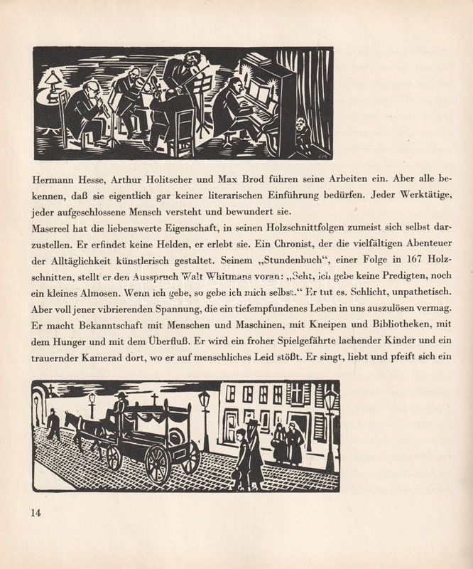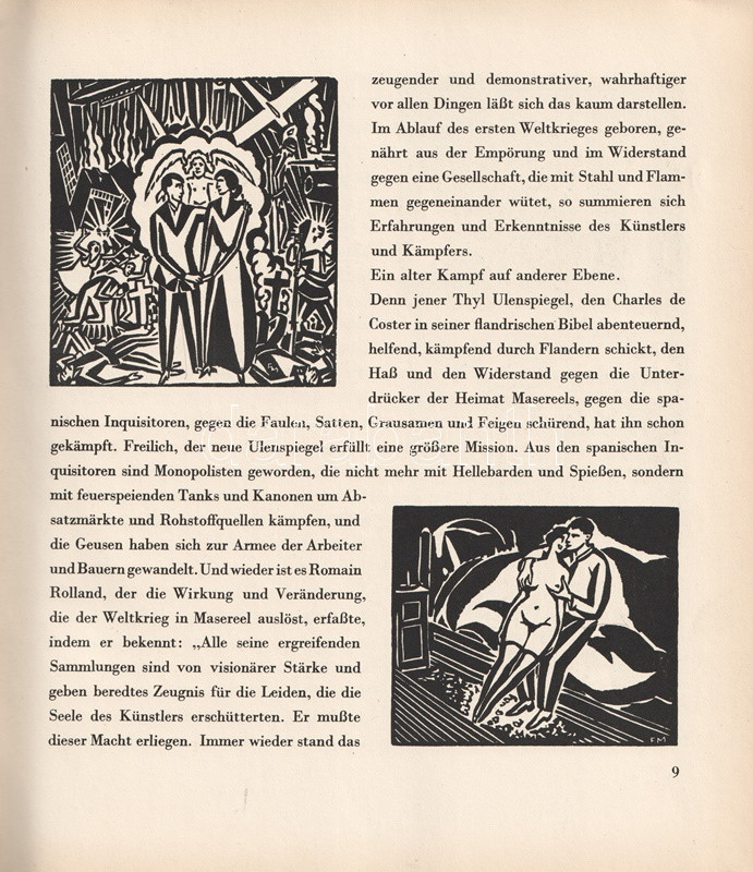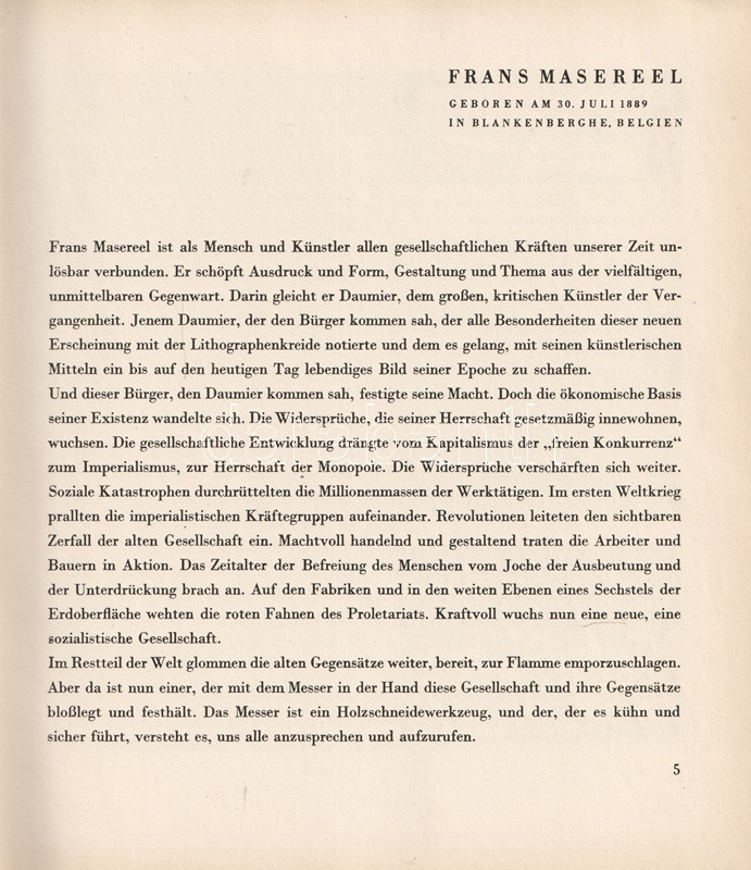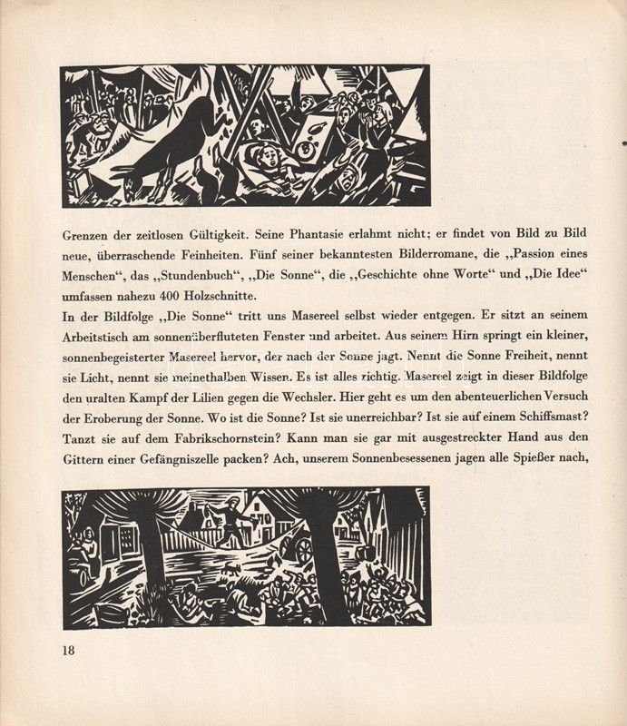 Frans Masereel (1889-1972) belga grafikusművész. Expresszionista grafikái a városi kisember társadalmi, politikai és magánéleti nyomorúságát örökítik meg elemi erővel. Pályája elején több, felirat nélküli képnovellát rajzolt, később Émile Zola, Thomas Mann, Stefan Zweig, valamint honfitársa, Charles de Coster műveit illusztrálta.