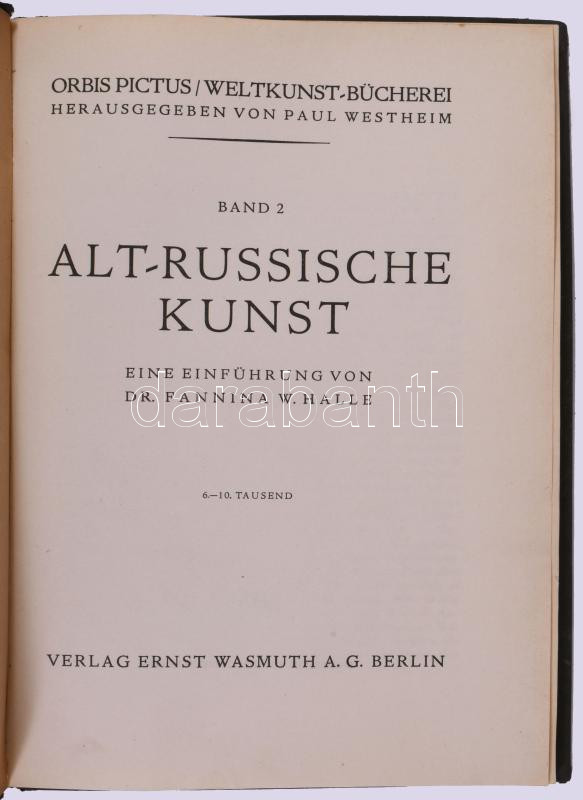 Halle, Fannina W.: Alt-russische Kunst. Orbis Pictus Band 2. Berlin, Ernst Wasmuth. Javított gerincű kartonált kötés, kopottas állapotban.