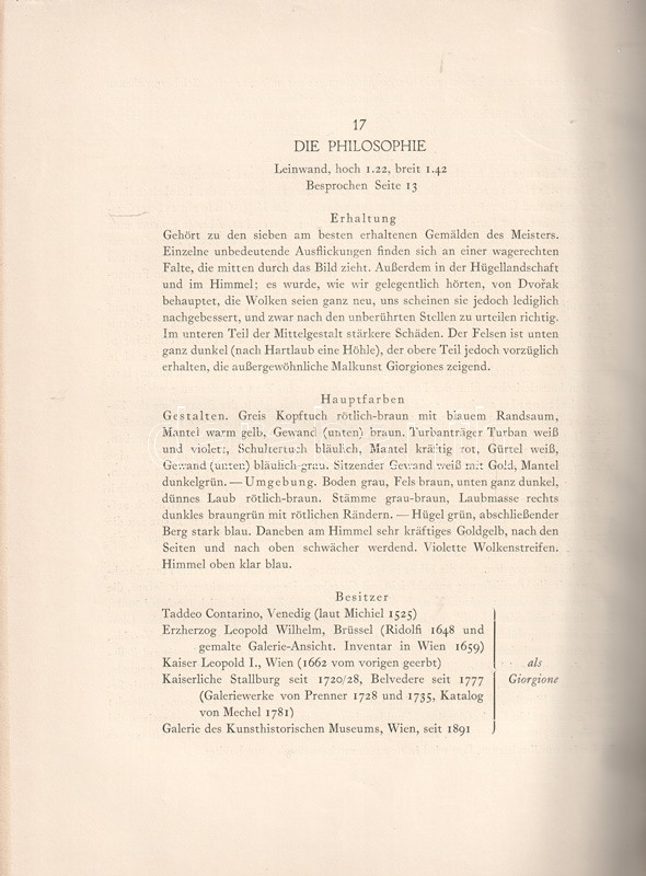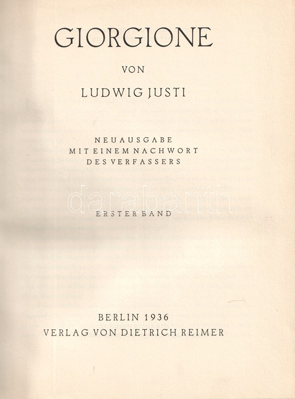 Ludwig Justi (1876-1957) német művészettörténész, muzeológus, múzeumigazgató. Bár tudományos habilitációját régi német mesterekről írta, múzeumigazgatóként elsősorban az expresszionista festészet támogatásáról nevezetes. Kétkötetes Giorgione-monográfiája 1926-ban jelent meg, példányunk a mű második kiadásából való.