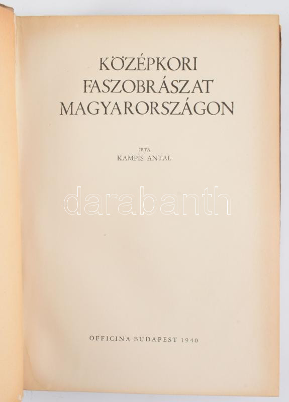 Kampis Antal: Középkori faszobrászat Magyarországon. Bp., 1940, Officina. 313p. Kiadói fatáblás kötés, gerinc sérült, kopottas állapotban.