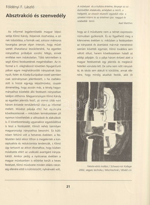 Klimó Károly (sz. 1936) Munkácsy-díjas festőművész és grafikus, a Képzőművészeti Főiskola tanára, a kortárs nonfiguratív festészet meghatározó alakja. Magyar-német nyelvű albumunk 13-20. és 29-88. oldalai között színes képtáblák.
