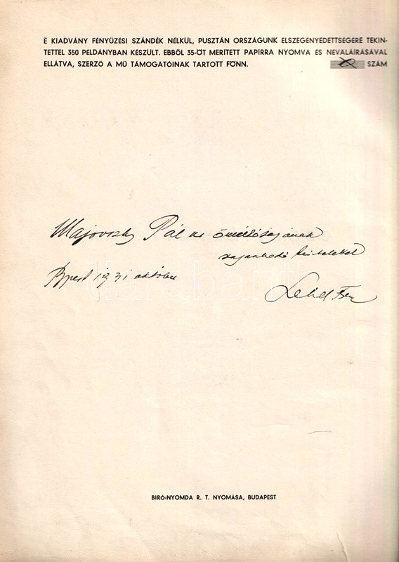 Dedikált: "Majovszky Pál úr őméltóságának ragaszkodó tisztelettel Lehel Ferenc. Bpest, 1931. október."