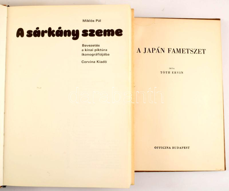 Miklós Pál: A sárkány szeme. Bevezetés a kínai piktúra ikonográfiájába. Bp., 1973, Corvina. 271p. Kiadói egészvászon kötés, papír védőborítóval, kissé kopottas állapotban. + Tóth Ervin: A japán fametszet. Bp., 1942, Officina. Félvászon kötés, jó állapotban.