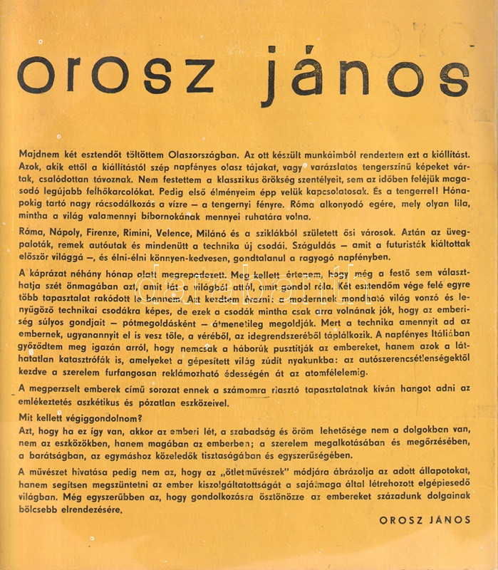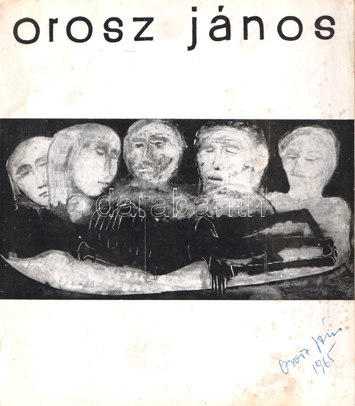 Orosz János (1932-2019) Munkácsy-díjas festőművész. A Képzőművészeti Főiskolán Fónyi Géza és Barcsay Jenő tanítványa. 1963-tól olaszországi tanulmányokon vett részt. Tárlatát 'Megégett emberek" címmel rendezte. Illusztrált, hajtogatott, kissé foltos katalógusunk előoldalán a művész saját kezű aláírása: "Orosz János, 1965."