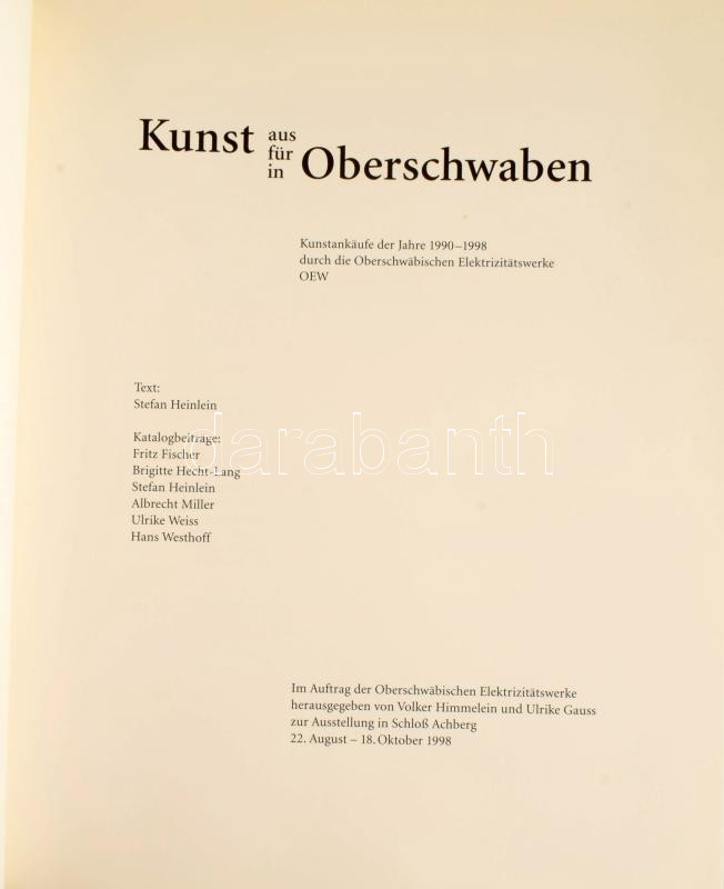 Stefan Heinlein: Kunst - aus - für - in Oberschwaben. Kunstankäufe der Jahre 1990 - 1998 durch die Oberschwäbischen Elektrizitätswerke OEW. (Ostfildern-Ruit, 1998, Cantz'sche Druckerei-ny.) Német nyelven. Gazdag képanyaggal illusztrált. Kiadói egészvászon-kötés, kiadói papír védőborítóban.