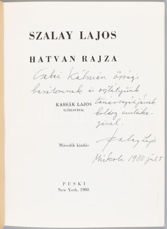 Szalay Lajos hatvan rajza. Kassák Lajos elÅ‘szavával. A művész, Szalay Lajos (1909-1995) Kossuth-dÃjas grafikus által Csabai Kálmán (1915-1992) Munkácsy-dÃjas festÅ‘művész részére dedikált példány! New York, 1980, Püski, [4] p.+ 30 t. Második kiadás. Kiadói papÃrkötés.