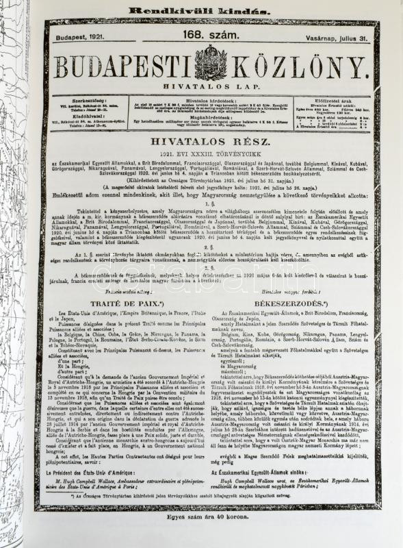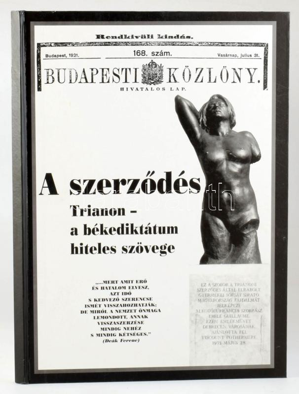 A szerződés. Trianon - a békediktátum hiteles szövege. (A Trianoni Békeszerződés reprint kiadása - a Budapesti Közlöny 1921-es rendkívüli számában megjelent eredeti alapján.) Debrecen, 2000, Migan, 3 sztl. lev.+ 94 p. Kiadói papírkötés.