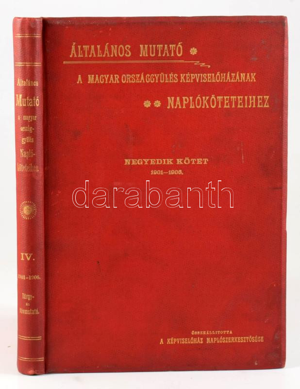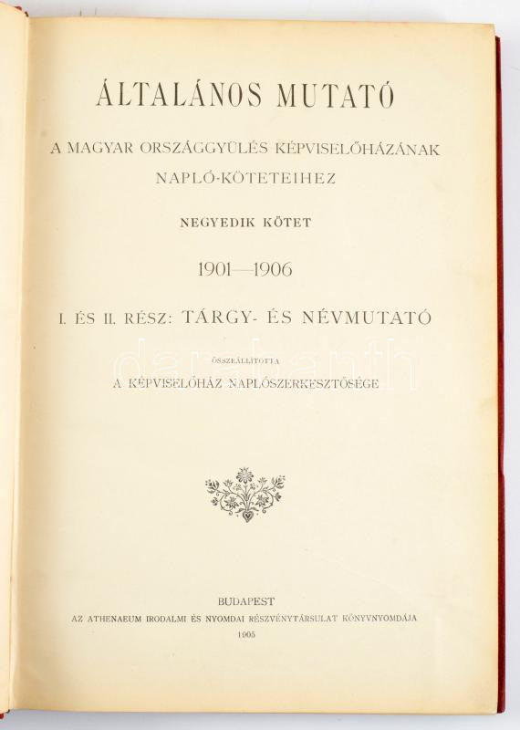 Általános mutató a magyar országgyűlés képviselőházának napló-köteteihez IV. kötet 1901-1906. I. és II. rész: Tárgy- és névmutató. Bp., 1905. Athenaeum. 310p. Aranyozott egészvászon kötésben. Ritka!