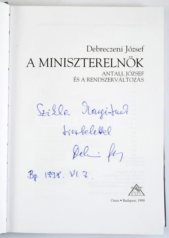 Debreczeni József: A miniszterelnök. Antall József és a rendszerváltozás. A szerző, Debreczeni József (1955- ) politikus, politikai elemző, közíró által DEDIKÁLT példány. Bp., 1998, Osiris. Első kiadás. Kiadói kartonált papírkötés.