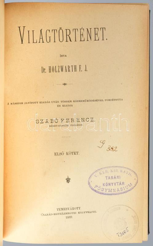 Dr. Holzwarth F. J.: Világtörténet. I-IX. kötet. Temesvár, 1889, Csanád-Egházmegyei Könyvsajtó. Újrakötött egészvászon kötés, jó állapotban.
