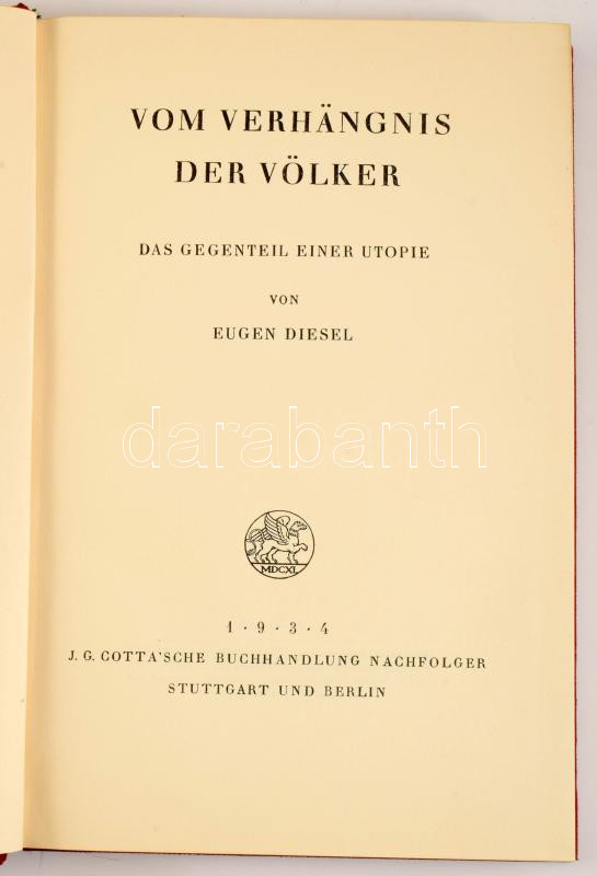Eugen Diesel: Vom Verhängnis der Völker. Das Gegenteil einer Utopie. Stuttgart und Berlin, 1934, J. G. Gotta'sche. Német nyelven. Kiadói egészvászon-kötés.