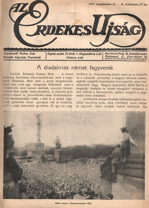 [Folyóirat] Az Érdekes Ujság képes hetilap első világháborús lapszámai. Szerkesztő: Kabos Ede. II/37, II/42-49, II/51-52; IV/14. (15 lapszám 1914. szeptember 13 - 1916. január 23. között) [Egybekötve.]