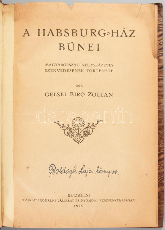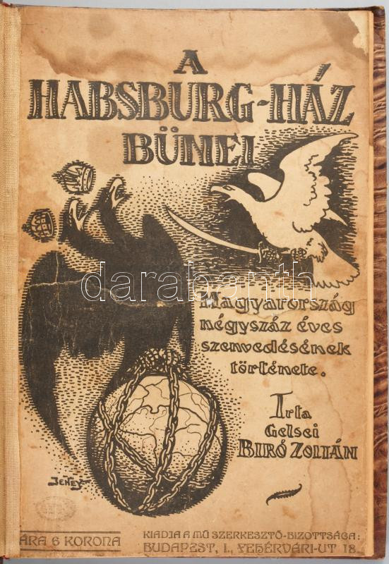 Gelsei Bíró Zoltán: A Habsburg-ház bűnei. Magyarország négyszázéves szenvedésének története. Bp., 1919, "Pátria", 96 p. Átkötött félvászon-kötés, bekötött elülső papírborítóval, sérült, javított címlappal, hiányzó elülső szennylappal, foltos lapokkal.