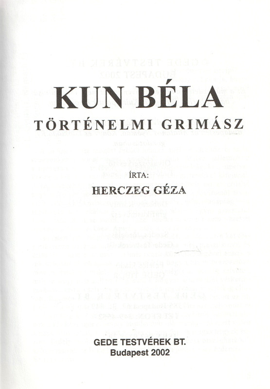 Herczeg Géza (1888-1954) jogász, újságíró, haditudósító, sajtófőnök. Kun Béla-életrajza sajátos korrajz a korabeli pesti kávéházi életről, a kommunista agitáció mentén megragadható karrierutakról, illetve a Tanácsköztársaság hatalmi viszonyairól és módszereiről. A Tanácsköztársaságról kedvezőtlen képet adó kötet első kiadása először német nyelven jelent meg, 1928-ban, ezt követte a magyar nyelvű kiadás, 1929-ben. A pályakép rákerült az Ideiglenes Nemzeti Kormány által 1945-ben betiltott művek jegyzékére.