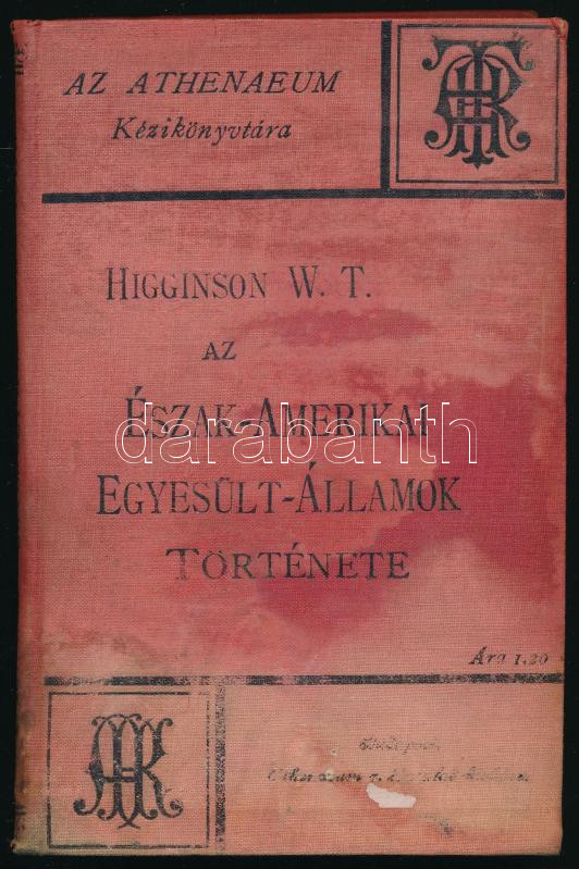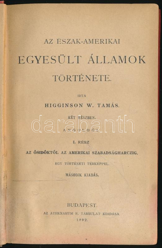 Higginson W. T.: Az Észak-Amerikai Egyesült Államok története 1-2. Egy kötetbe kötve. Bp., 1892. Athenaeum. 107., 133p. Kiadói foltos egészvászon kötésben, utolsó lapon hiány,