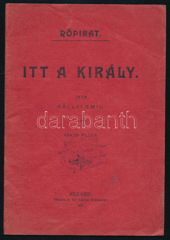 Kállai Emil: Itt a király.. Röpirat. Szeged, 1903, Traub B. és Társa. Kiadói papírkötés, kissé kopottas állapotban.
