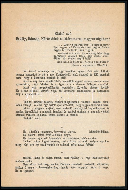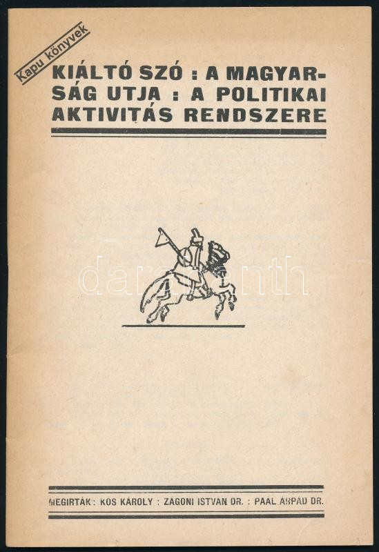Kós Károly - Zágoni István - Paál Árpád: Kiáltó szó. A magyarság útja. A politikai aktivitás rendszere. Kapu könyvek. H.n., é.n., Idegennyelvű Folyóirat Kiadó Leányvállalat, 48+[4] p. Hasonmás kiadás. Kiadói tűzött papírkötés.