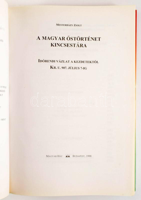Mesterházy Zsolt: A magyar Å‘störténet kincsestára. IdÅ‘rendi vázlat a kezdetektÅ‘l Kr. u. 907. július 7-ig. A szerzÅ‘, Mesterházy Zsolt (1951-) által dedikált példány! Bp., 1998, Magyar Ház, 344 p. Kiadói kartonált papÃrkötés, kissé kopottas borÃtóval.