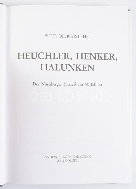 Peter Dehoust (hrsg.): Heuchler, Henker, Halunken. Der Nürnberger Prozeß vor 50 Jahren. Corburg,1996,Nation Europa. Német nyelven. Fekete-fehér képanyaggal illusztrált. Kiadói egészvászon-kötés, kiadói papír védőborítóban.