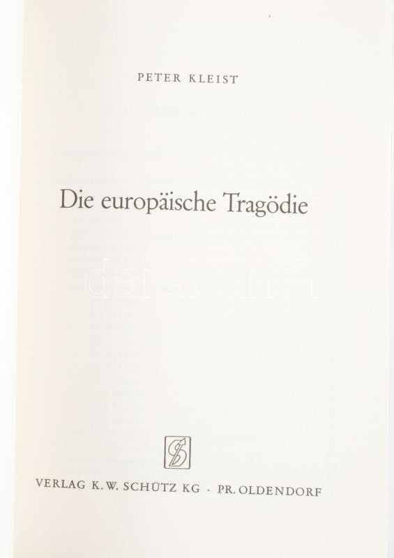 Peter Kleist: Die Europaische Tragödie. Pr. Oldendorf,1971,K. W. Schütz KG. Német nyelven. Fekete-fehér képanyaggal illusztrált. Kiadói papírkötés.