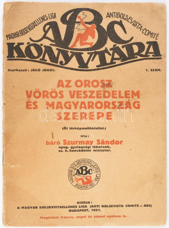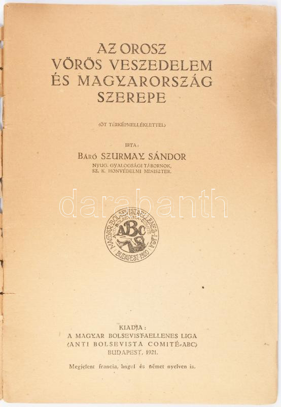 Szurmay Sándor, báró: Az orosz vörös veszedelem és Magyarország szerepe. ABC könyvtára 1. sz. Bp., 1921, Magyar Bolsevistaellenes Liga (Anti Bolsevista Comité = ABC), 35+[1] p. Egyetlen kiadás. Kiadói tűzött papírkötés, sérült borítóval. A mű szerepel az 1945-ben az Ideiglenes Nemzeti Kormány által betiltott, fasiszta és szovjetellenes könyvek listáján.