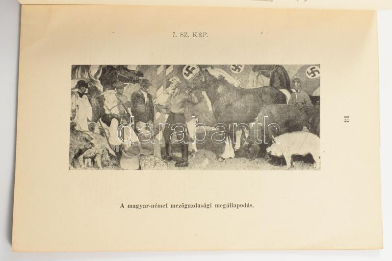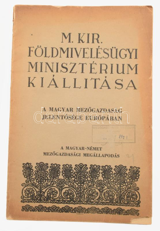 cca 1939 M. Kir. Földmivelésügyi Minisztérium kiállítása. A magyar mezőgazdaság jelentősége Európában. A magyar-német mezőgazdasági megállapodás. Bp.,én.,Centrum,36 p. Gazdag fekete-fehér képanyaggal illusztrált. Kiadói papírkötés, sérült borítóval, foltos.