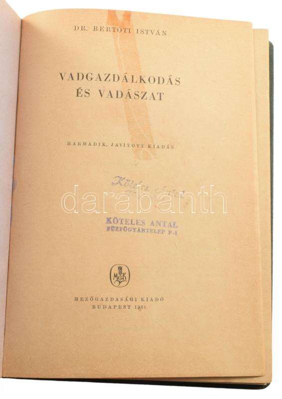 Bertóti István: Vadászat és vadgazdálkodás. Bp.,1961, Mezőgazdaság, 327+1 p.+16 (fekete-fehér fotók) t. Átkötött egészvászon-kötés, javított címlappal.