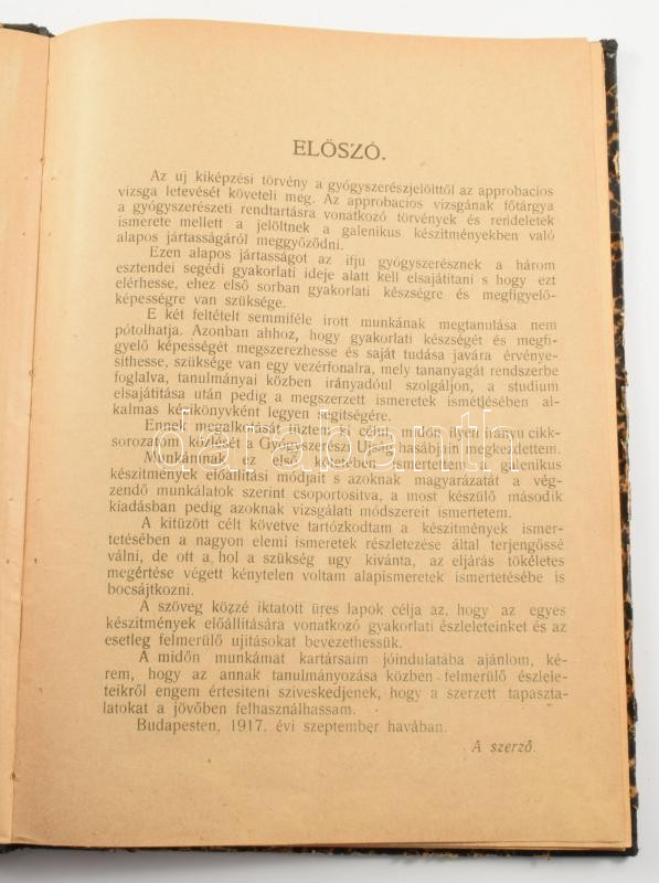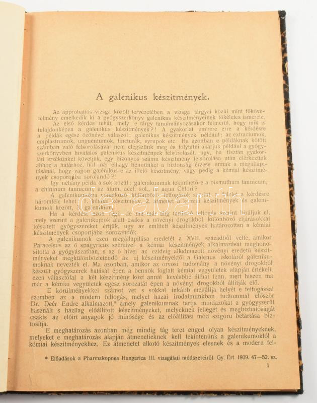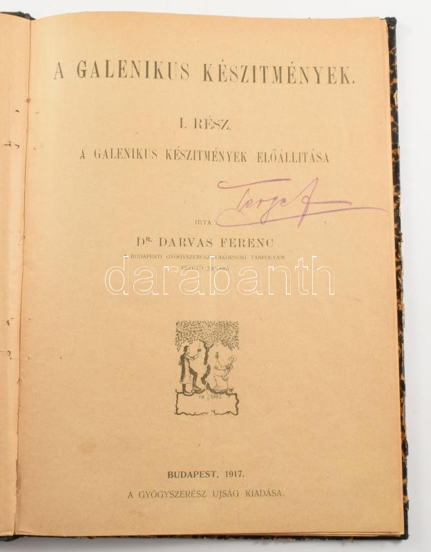 Darvas Ferenc: A galenikus készítmények I. rész: A galenikus készítmények előállítása. Bp., 1917, Gyógyszerész Ujság, 6+63p. Átkötött félvászon-kötés, kopott borítóval, néhány lapon ceruzás aláhúzásokkal és jegyzettel, a lapok mellett bekötött fehér [üres] jegyetlapokal.