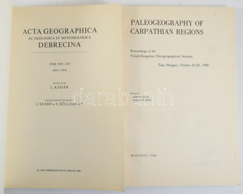 2 db földtani kiadvány: Acta Geographica ac geologica et meteorologica Debrecina 1975. Tom XIV-XV. + Paleogeography of Carpathian Regions. Bp., 1998. 191p.