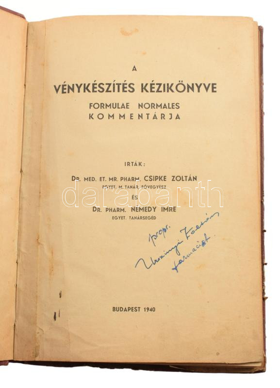 Csipke Zoltán - Némedy Imre: A vénykészítés kézikönyve. Formulae Normales kommentárja. Bp., 1940.,(Máté-ny.), 270 p. Átkötött félvászon-kötés, kopott, foltos borítóval, a gerincen sérüléssel, ceruzás bejegyzésekkel.