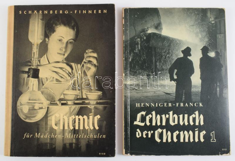 Henniger - Franck: Lehrbuch der Chemie für höhere Schulen. Band 1. Leipzig - Berlin, 1940, B. G. Teubner. Német nyelven. Fekete-fehér illusztrációkkal. Kiadói papírkötés, kopott borítóval. + Scharnberg - Finnern: Chemie für Mädchen - Mittelschulen. Leipzig - Berlin, 1942., B. G. Teubner. Német nyelven. Fekete-fehér illusztrációkkal. Kiadói félvászon-kötés.