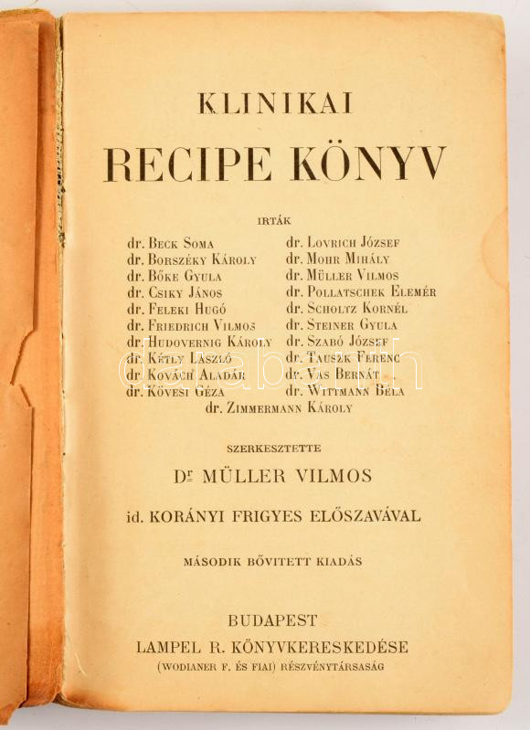 Müller Vilmos (szerk.): Klinikai recipe könyv. id. Korányi Frigyes előszavával. Bp., [1907], Lampel R., XVI+547+[17] p. Második, bővített kiadás. Kiadói egészvászon-kötés, viseltes állapotban, sérült, ragasztott gerinccel, kijáró előzéklappal.