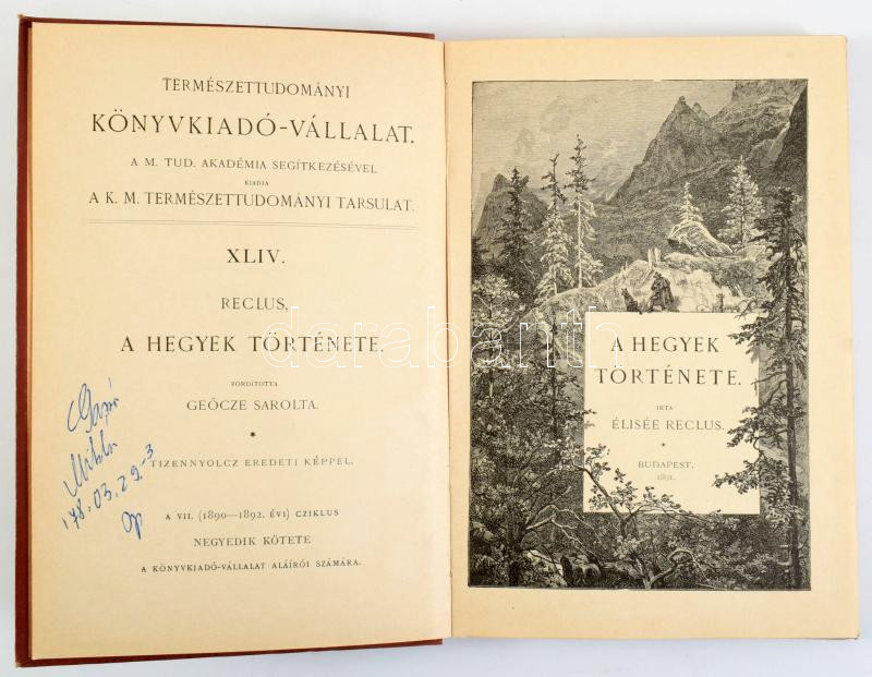 Reclus, Élisée: A hegyek története. Ford.: Geőcze Sarolta. Bp., 1891, K. M. Természettudományi Társulat (Franklin-ny.), VIII+209+(3) p. Szövegközti és egészoldalas illusztrációkkal. Kiadói egészvászon-kötés, jó állapotban