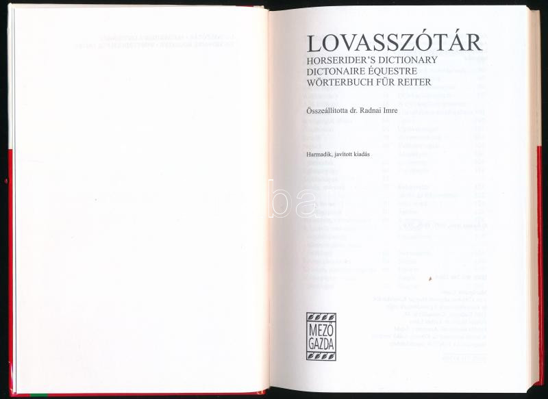 Lovasszótár. / Horserider's Dictionary. / Dictonaire équestre. / Wörterbuch für Reiter. Összeáll.: Radnai Imre. Bp., 2006, Mezőgazda Kiadó, 231+[1] p. Kiadói kartonált papírkötés.