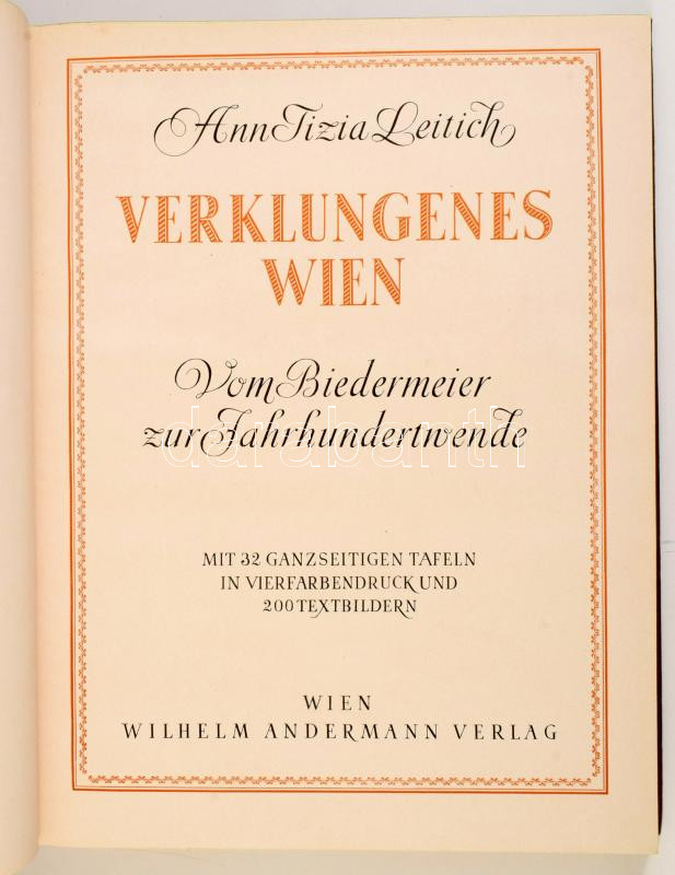 Ann Tizia Leitich: Verklungenes Wien. Vom BIedermeier zur Jahrhundertwende. Wien, 1942, Wilhelm Andermann. Gazdag fekete-fehér és színes képanyaggal illusztrálva. Német nyelven. Kiadói félvászon-kötés, kissé viseltes borítóval, belül a lapok jó állapotban.