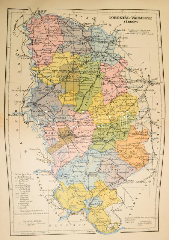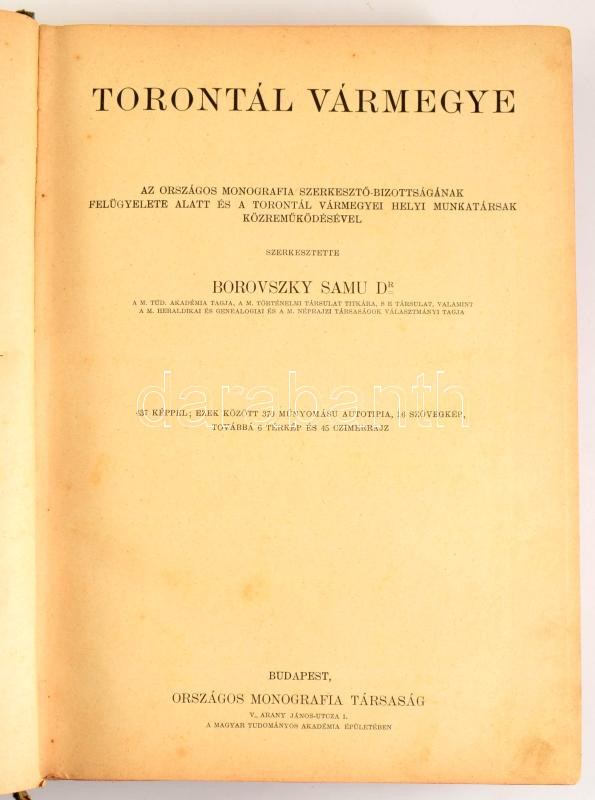 Borovszky Samu (szerk.): Torontál vármegye. Magyarország vármegyéi és városai. Magyarország monográfiája. Bp., [1911], Országos Monográfia Társaság, XII+632 p.+ 1 (kihajtható térkép) t. Oldalszámozáson belül fekete-fehér képtáblákkal illusztrálva. Kiadói aranyozott, festett, dombornyomott egészvászon-kötés, Gottermayer-kötés, viseltes állapotban, hiányzó gerinccel, foltos borítóval, helyenként kijáró lapokkal.