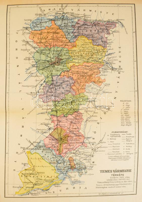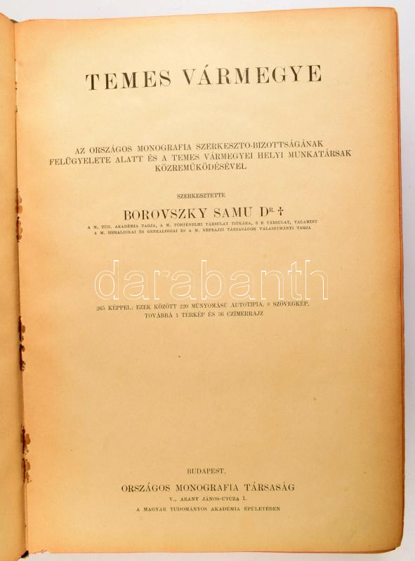 Dr. Borovszky Samu (szerk.): Temes vármegye és Temesvár. Magyarország vármegyéi és városai. Magyarország monográfiája. Bp.,é.n., Országos Monográfia Társaság, 1 (Temes vármegye térképe) t.+X+463+7+V+1+294 p. RendkÃvül gazdag egészoldalas és szövegközti képanyaggal, és egy térképpel illusztrált. Kiadói aranyozott, festett, dombornyomott, illusztrált egészvászon-kötés, Gottermayer-kötés, szÃnezett lapszélekkel, kopottas borÃtóval, sérült gerinccel.