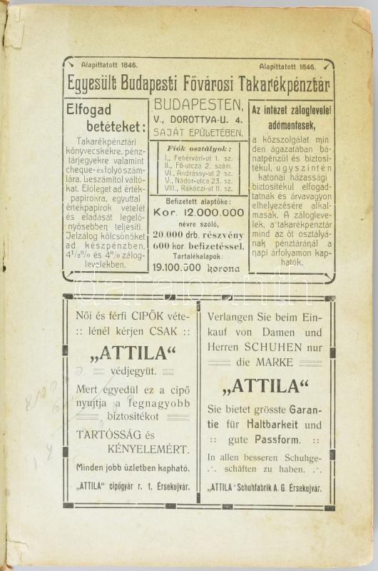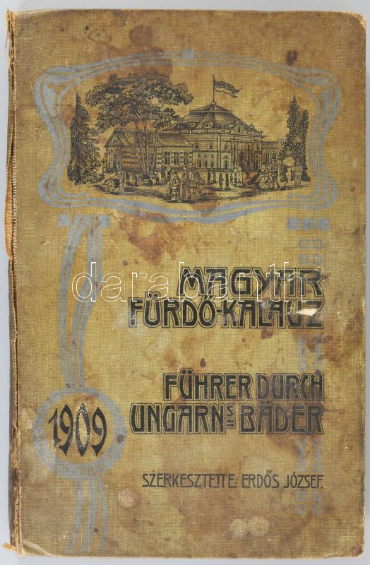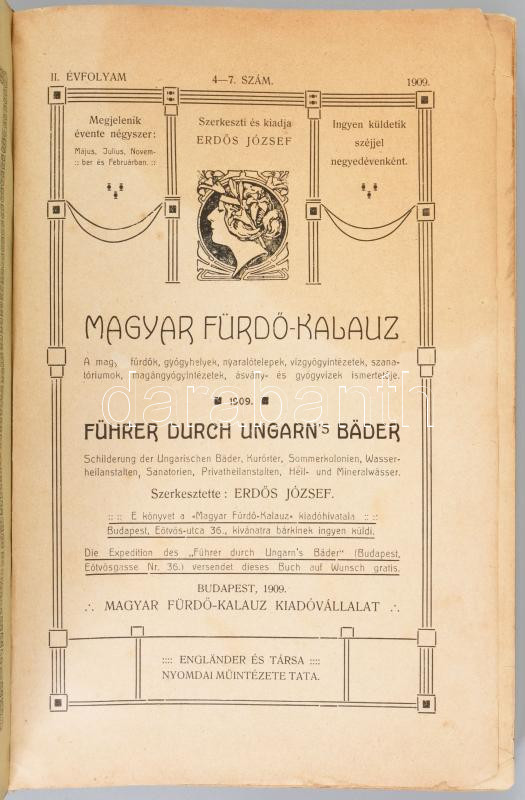 Erdős József (szerk.): Magyar fürdő-kalauz. A magyar fürdők, gyógyhelyek, nyaralótelepek, vizgyógyintézetek, szanatóriumok, magángyógyintézetek, ásvány- és gyógyvizek ismertetője. II. évf. 4-7. szám. Bp., 1909, Magyar Fürdő-Kalauz Kiadóvállalat, 330 p. Fekete-fehér képekkel, reklámokkal. Kiadói egészvászon-kötés, viseltes, foltos borítóval, sérült gerinccel, helyenként kissé sérült, foltos lapokkal, az utolsó két lap és a hátsó szennylap kijár.