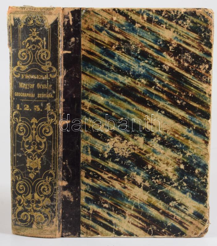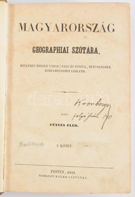 Fényes Elek: Magyarország geographiai szótára I-IV. köt (egybe kötve). Magyarország geographiai szótára, mellyben minden város, falu és puszta, betűrendben körülményesen leiratik. [Két kötetben.] Pest, 1851, Kozma Vazul, 312, 285 p. 306, 350 p. Első kiadás!