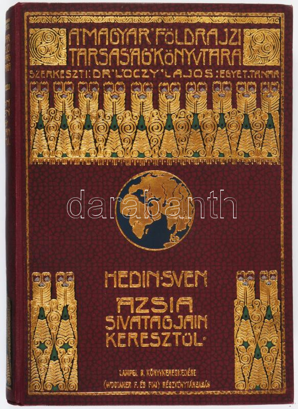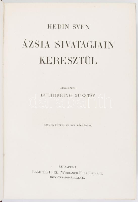 Hedin, Sven: Ázsia sivatagjain keresztül. Ford.: Thirring Gusztáv. A Magyar Földrajzi Társaság Könyvtára. Bp., [1902], Lampel R., 1 (címkép) t.+ 221+[3] p.+ 15 (fekete-fehér képek) t.+ 2 (térképek) t. Kiadói aranyozott egészvászon sorozatkötés, nagyrészt jó állapotban.