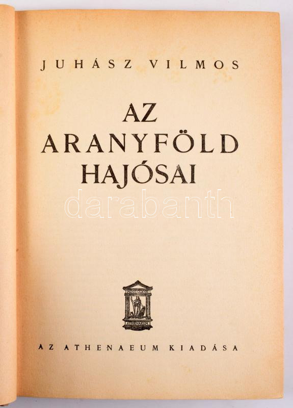 Juhász Vilmos: Az aranyföld hajósai. Bp., [1936], Athenaeum, 275+(1) p.+ 8 t. Kiadói egészvászon-kötés, kissé foltos, kopottas borítóval.