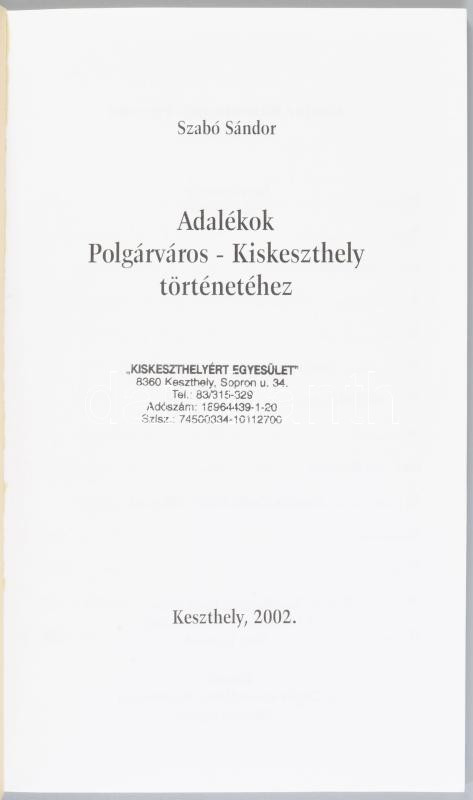 Szabó Sándor: Adalékok Polgárváros - Kiskeszthely történetéhez. Keszthely, 2002, Kiskeszthelyért Egyesület, 52 p. Kiadói papírkötés. Megjelent 500 példányban.